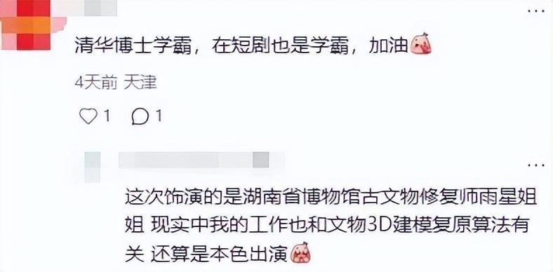 这部短剧讲述围棋文化,她饰演湖南省博物馆古文物修复师。现实生活中,袁博士的工作,和文物3D建模复原算法有关,算是本色出演。