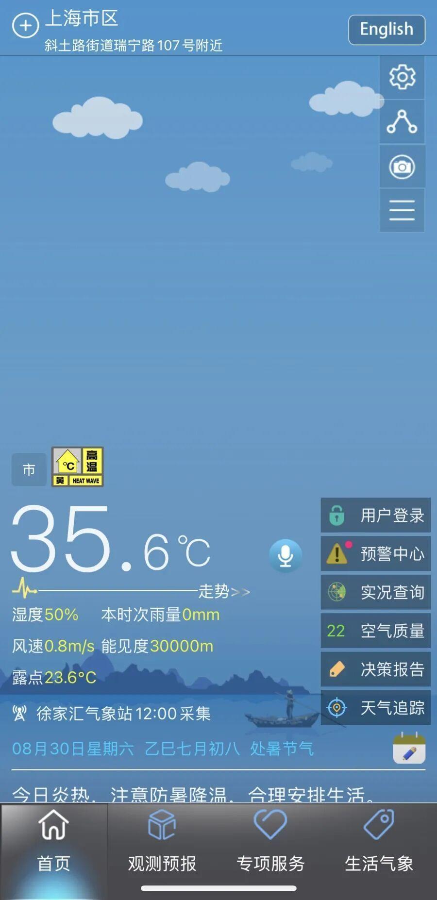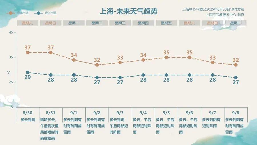 据上海中心气象台预报,明天依旧持续多云到晴的天气,最低气温预计有28℃,最高气温仍可达36℃~37℃。