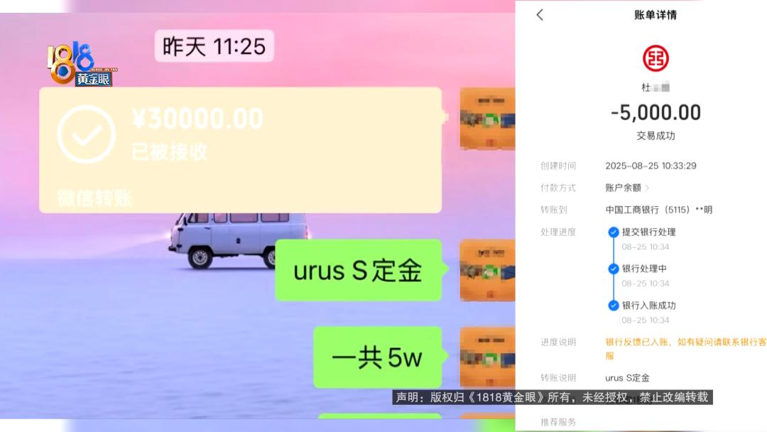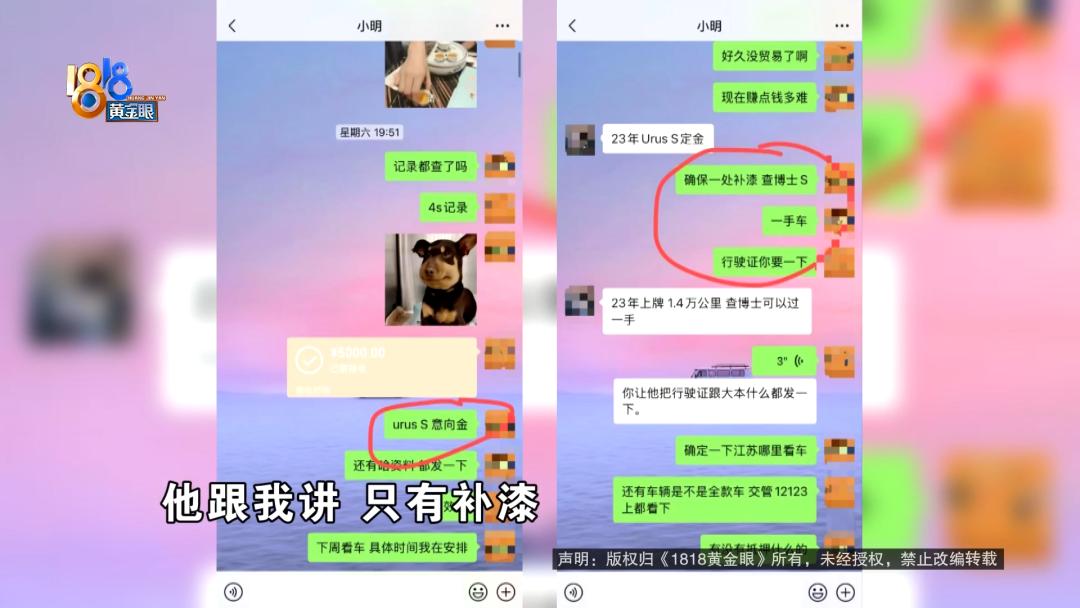 施老板:先打了5000元意向金。然后我跟他也用文字形式,也描述了要这个第三方验车必须是“S”,然后只一处补漆。记者:他跟你确认过这个车没有任何修过?施老板:对的,他跟我讲只有补漆,没有钣金。记者:这5000块钱是?施老板:意向金,对,意向金。记者:但我看他写的是“定金”。施老板:所以这只是他以为是定金。