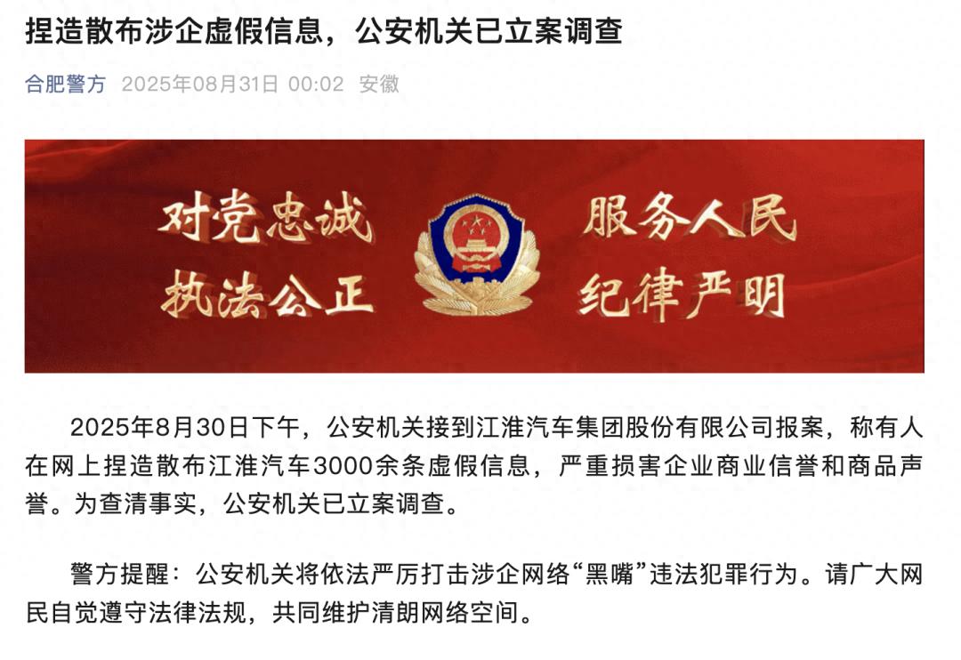 “合肥警方”微信公众号8月31日凌晨消息,2025年8月30日下午,公安机关接到江淮汽车集团股份有限公司报案,称有人在网上捏造散布江淮汽车3000余条虚假信息,严重损害企业商业信誉和商品声誉。为查清事实,公安机关已立案调查。