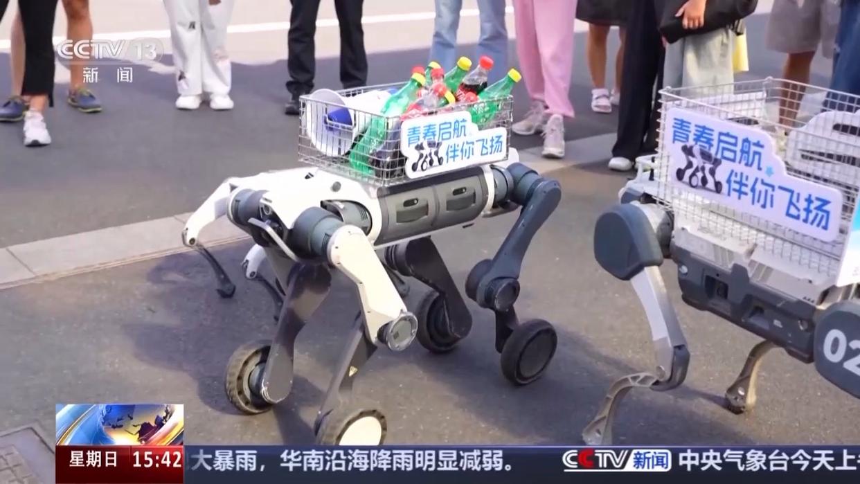 智能迎新小队工作人员 何霖:它们一个是腿足式的,一个是轮足式的。轮足式的移动速度要更快,腿足式的承载能力更高,能够负载40公斤,帮新生们、家长们减轻运送行李的压力。