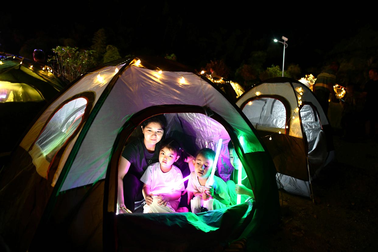8月29日,在湖北省咸宁市通城县黄龙林场,游客享受露营的乐趣。新华社发(刘建平摄)