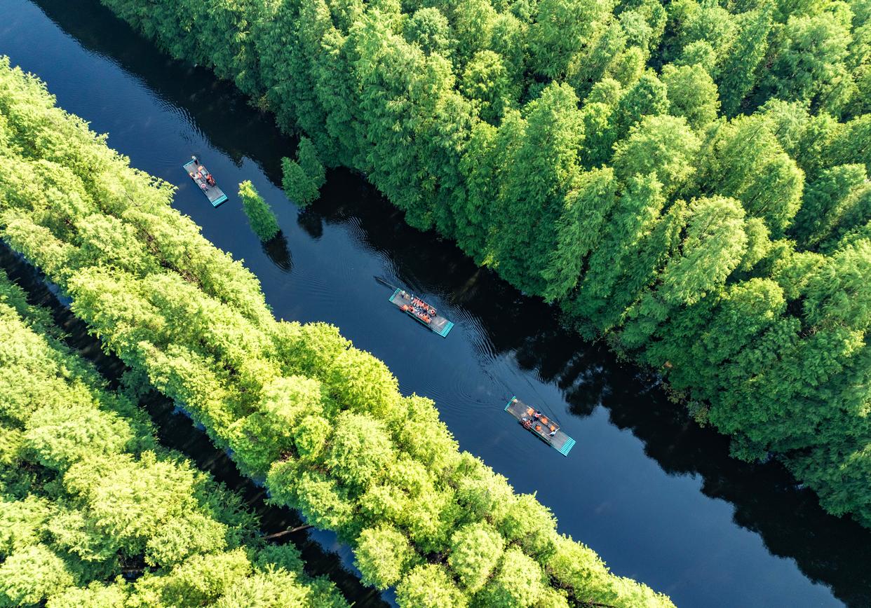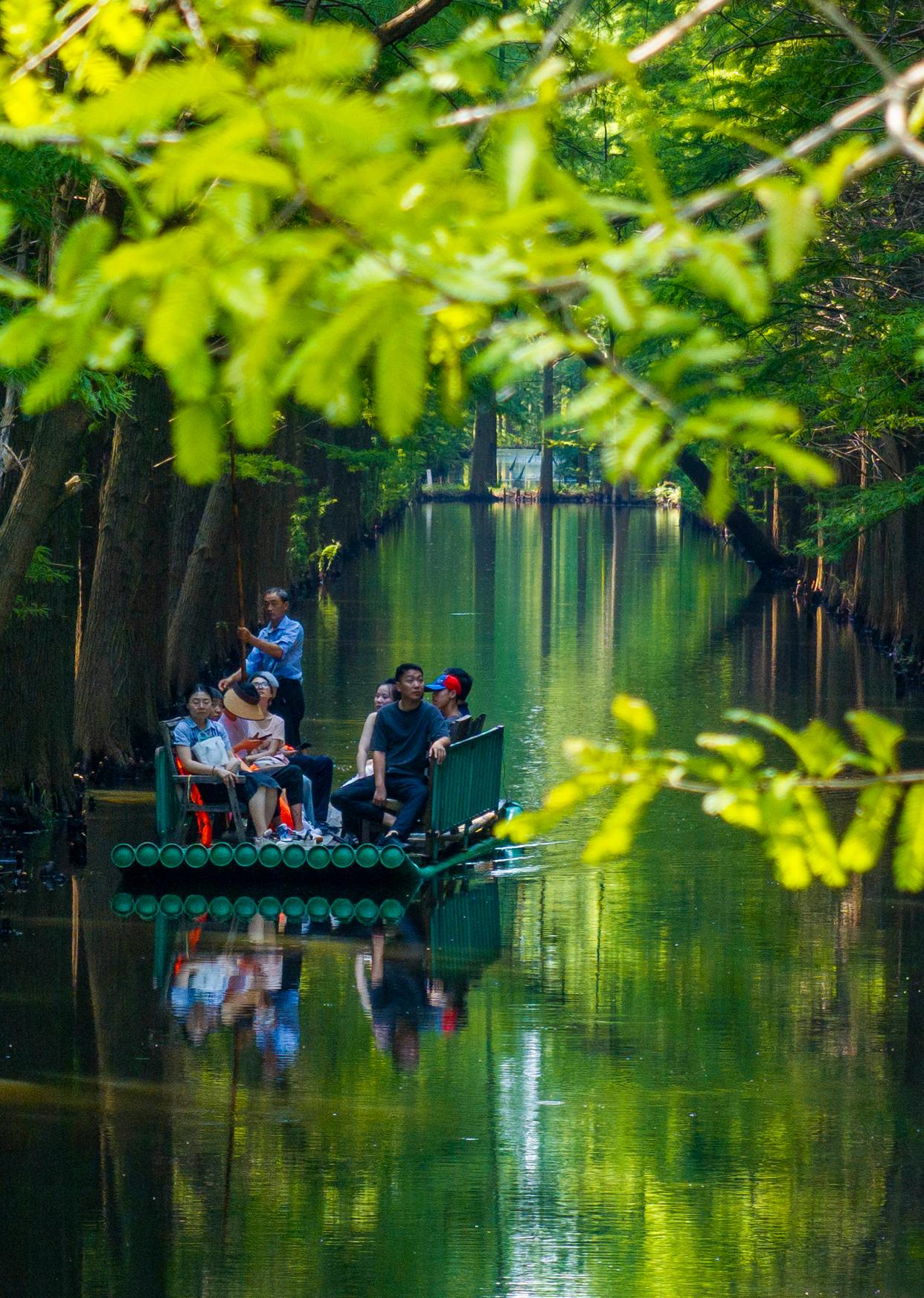 8月30日,游人在江苏省淮安市金湖县水上森林景区乘坐竹筏游览美景(无人机照片)。新华社发(周社根摄)