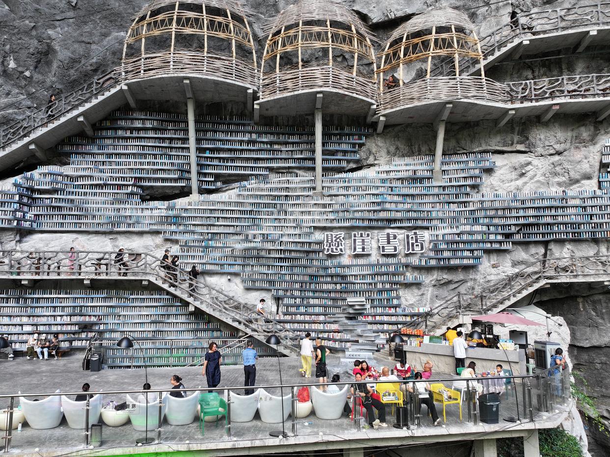 8月30日,游客在广西河池市罗城仫佬族自治县悬崖书店游玩(无人机照片)。新华社发(韦如代摄)