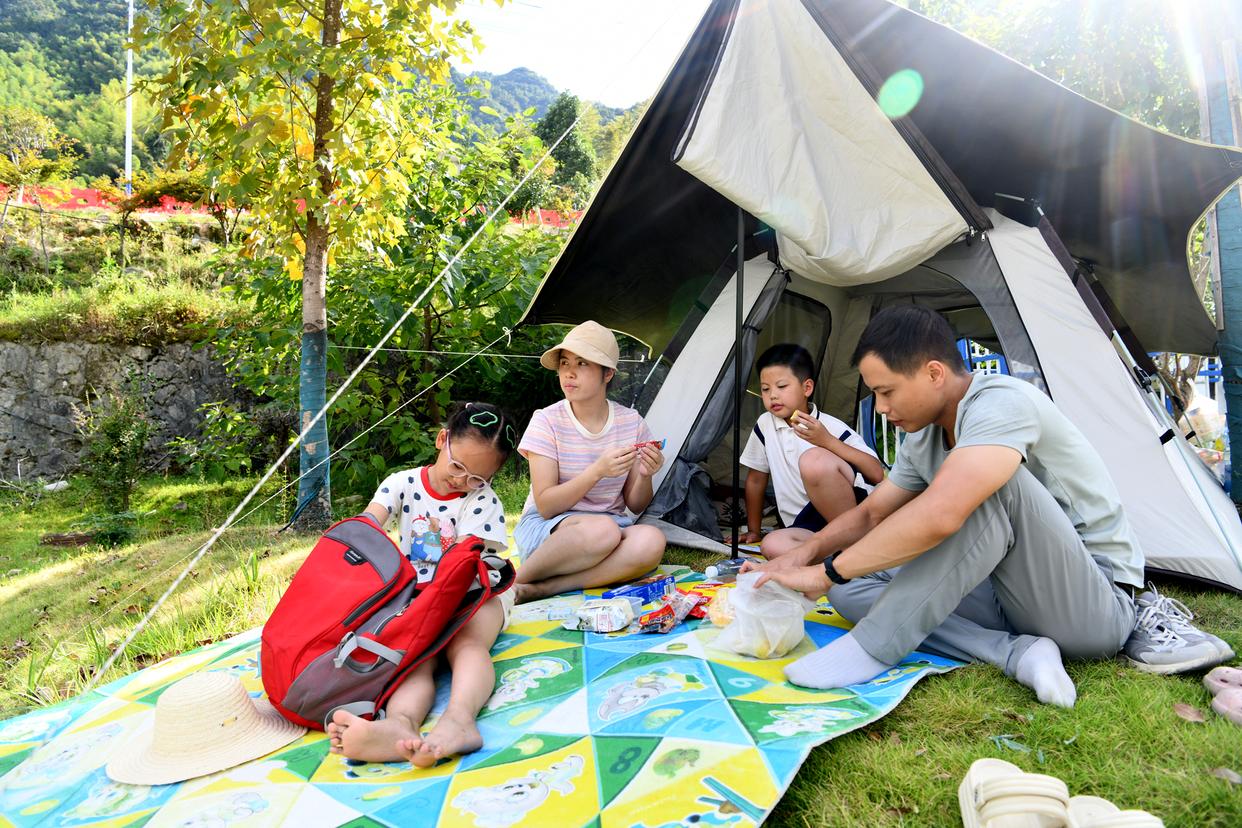 8月29日,在湖北省咸宁市通城县黄龙林场,游客搭起帐篷,享受露营的乐趣。新华社发(刘建平摄)