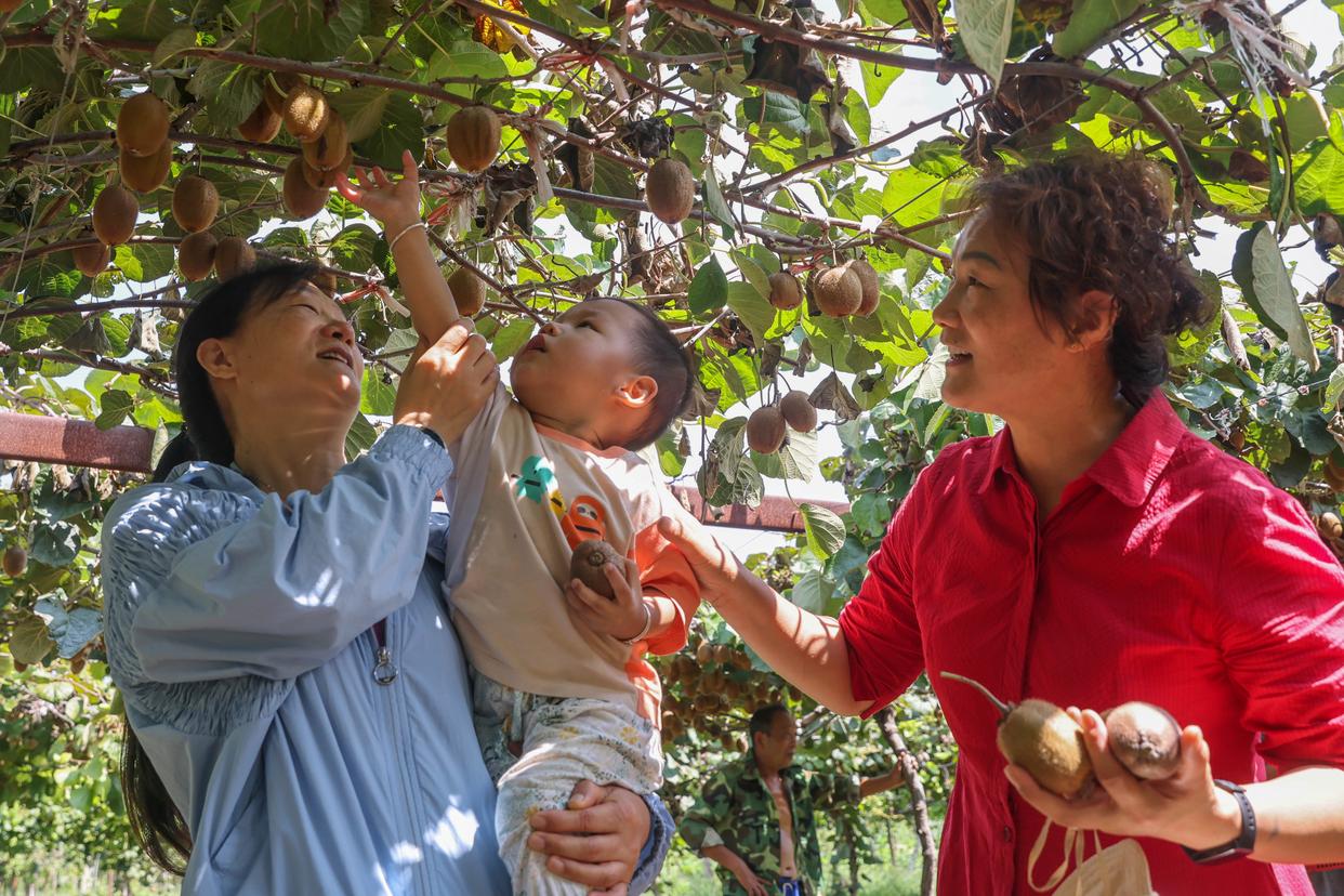 8月31日,游客在河南省平顶山市宝丰县闹店镇小张庄村一家猕猴桃种植园采摘。新华社发(何五昌 摄)
