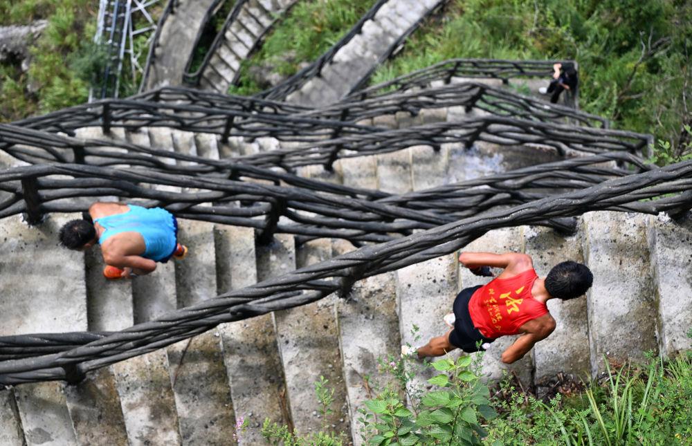 8月30日,选手在精英组秘径云梯速攀赛比赛中。新华社发(郭立亮 摄)