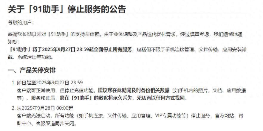 91助手称,因业务调整与产品迭代优化需求,91助手应用将于9月27日起全面停止所有服务,包括但不限于手机连接管理、文件传输、应用安装卸载、系统清理等核心功能。