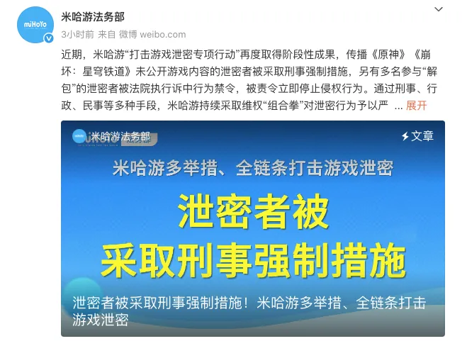 据@米哈游法务部 消息,近期,米哈游“打击游戏泄密专项行动”再度取得阶段性成果,传播《原神》《崩坏:星穹铁道》未公开游戏内容的泄密者被采取刑事强制措施,另有多名参与“解包”的泄密者被法院执行诉中行为禁令,被责令立即停止侵权行为。