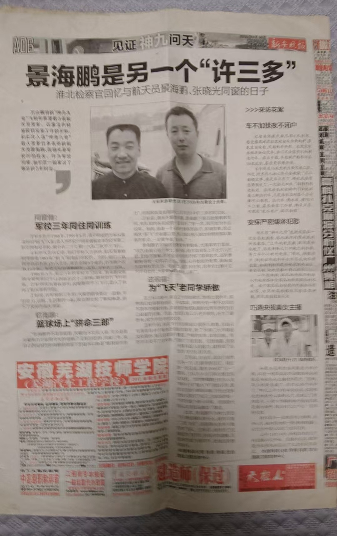 在这天的A06版,王标向新安晚报记者回忆了与航天员景海鹏、张晓光同窗的日子。
