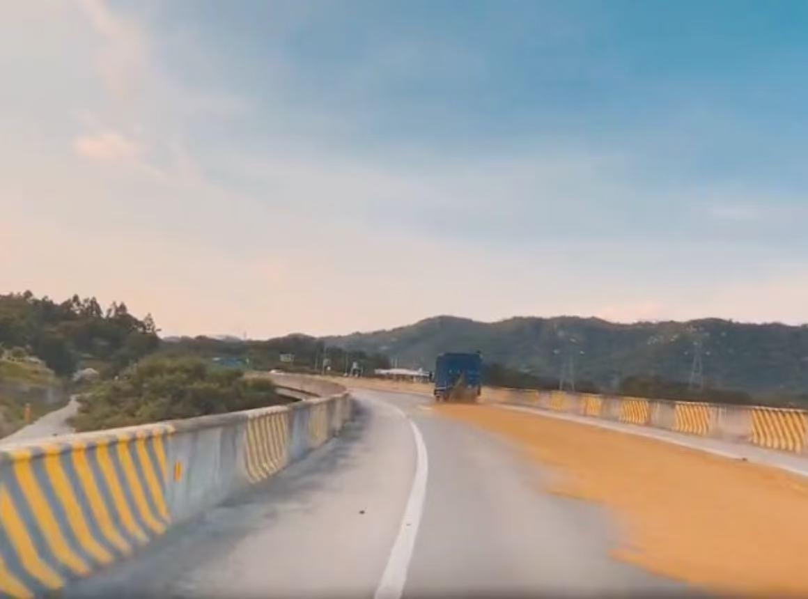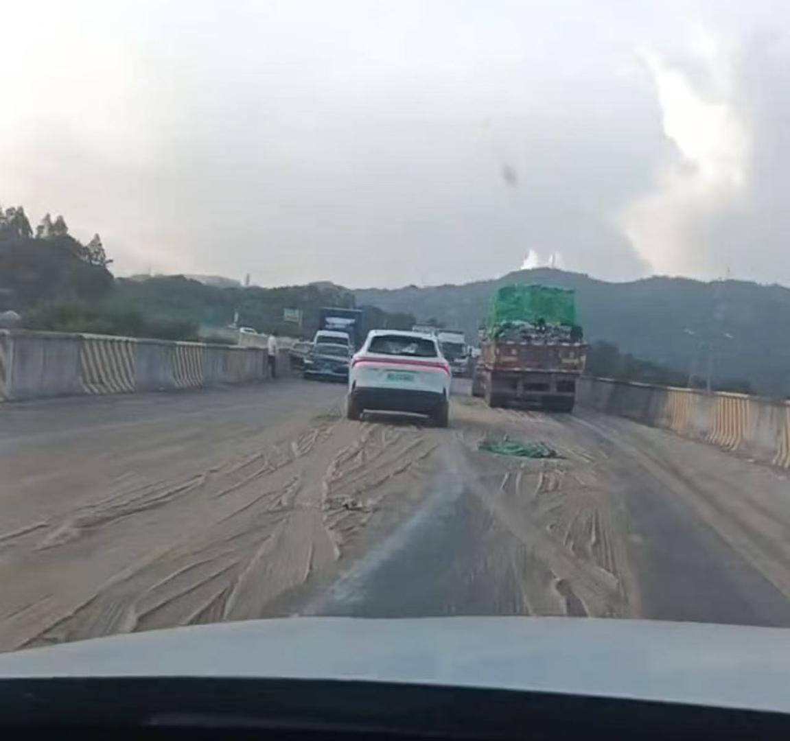 在多段网传视频中,红星新闻记者看到,有车主发布行车记录仪视频,显示在一道路上,靠右道路布满黄色泥状物。另外,还有一段行车记录仪视频疑似记录了不明黄色物来源。上面显示8月31日16时36分许,该车辆前方一辆货车行驶时,货车车厢有黄色液状物大量流漏至地面,该货车随后停止行驶。