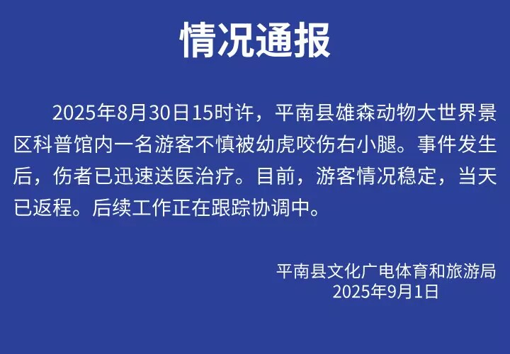 8月30日,广西贵港市平南县一动物园内,一名7岁小女孩在与小老虎近距离互动时,被其轻微咬伤右腿。目前,女孩家属与园方仍未就善后问题达成一致。