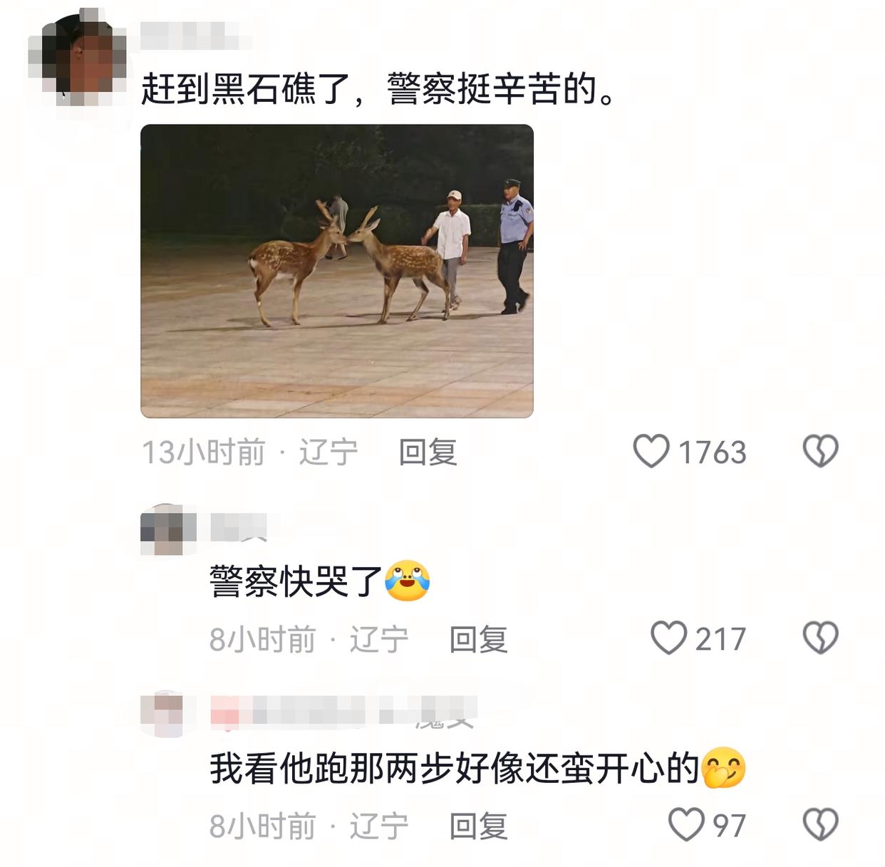 这一幕让不少网友忍俊不禁,纷纷打趣“某幸携手大连警察夜跑活动”“这就是星光不负赶‘鹿’人”,也有部分网友在看到警察赶鹿的模样后认为“我看他跑那两步好像还蛮开心的”。