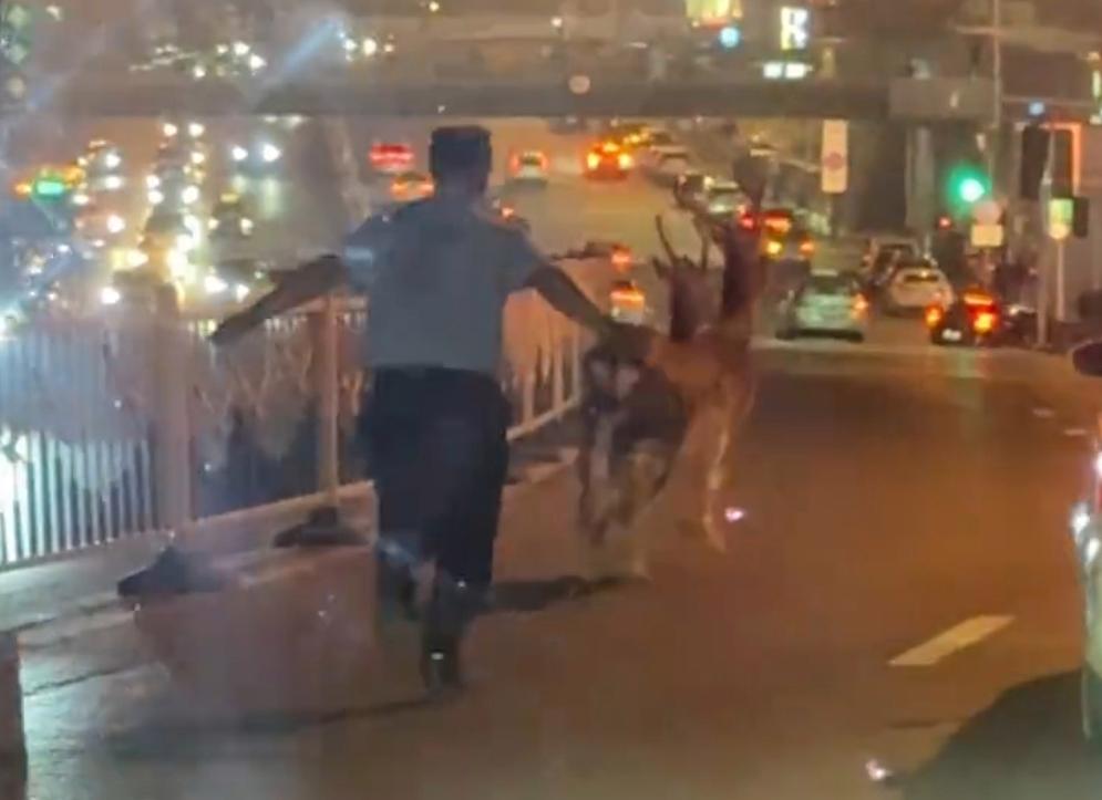 9月1日晚,多位大连市民发布视频称,在沙河口区黑石礁广场附近,两只梅花鹿在马路上散步,民警到场后,一名警察在梅花鹿身后拍手驱赶,并保持距离跟随。