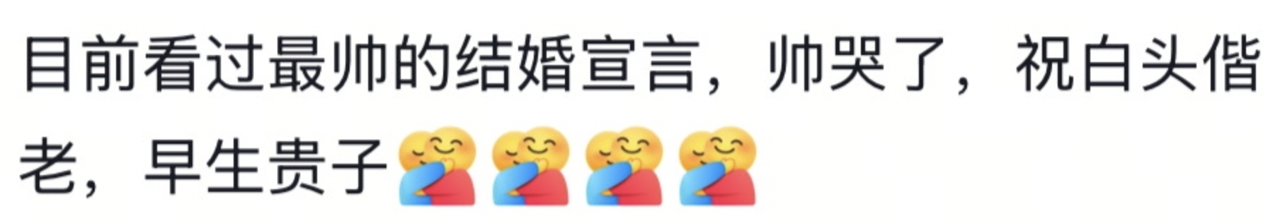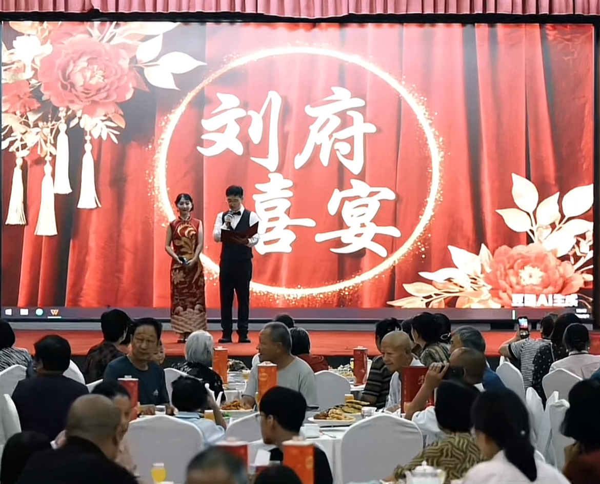 视频发布后,获得网友的爆赞,在评论区,夫妻俩收获了上万人的新婚祝福。有网友认为新郎的发言是“看过最帅的结婚宣言”。有细心网友注意到,舞台屏幕上“刘府喜宴”的背景照片都是AI生成的,不少人觉得又好笑又感动,直夸夫妻俩会控制成本。