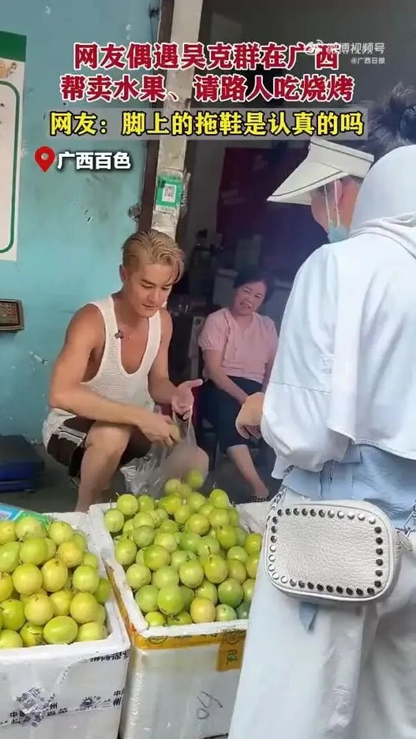 据@广西日报 9月1日消息,近日,有网友偶遇男星吴克群身着白色背心,脚踏拖鞋,在广西街头帮摊主卖水果。之后,他还请路人吃烧烤。