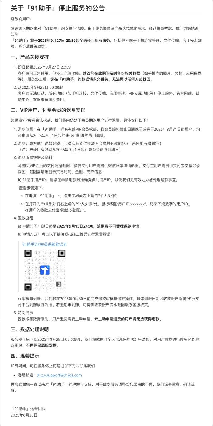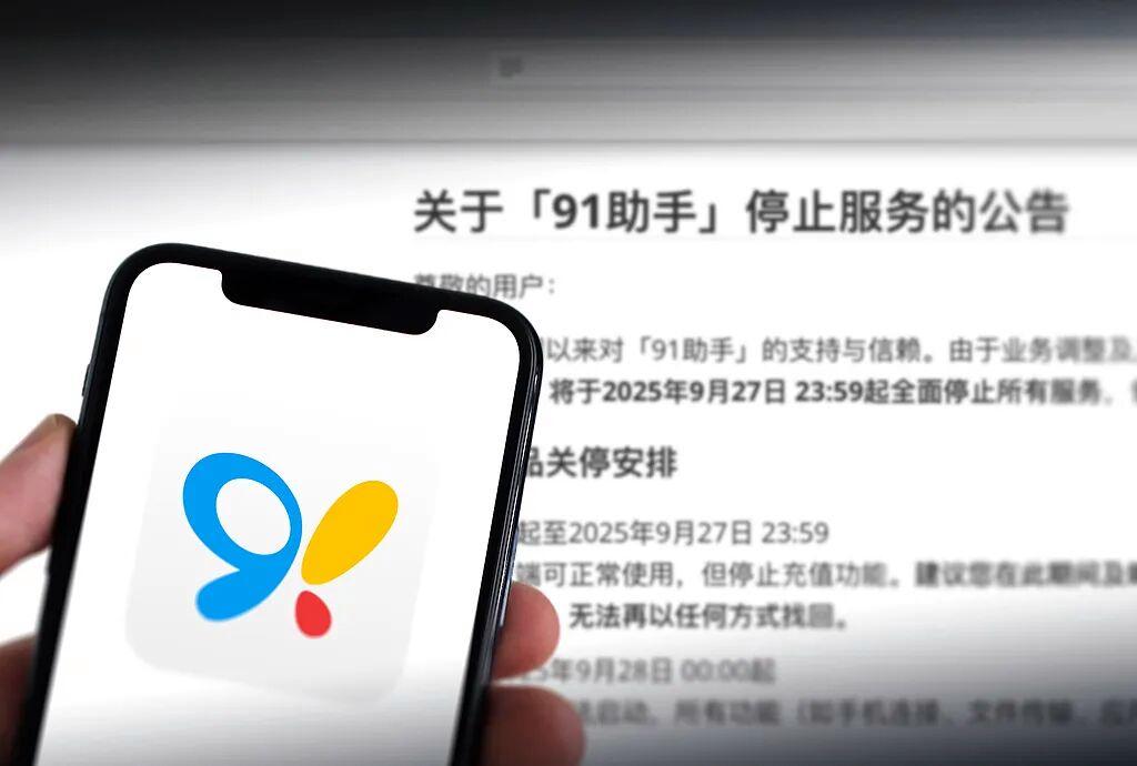 从9月28日开始,91助手客户端将无法启动、所有功能停服,官方网站、帮助中心及客服渠道也将同步关闭。91助手提醒用户,服务终止后,所有用户数据将被永久删除且不可恢复,建议用户尽快备份重要文件。
