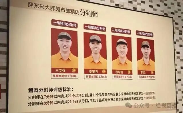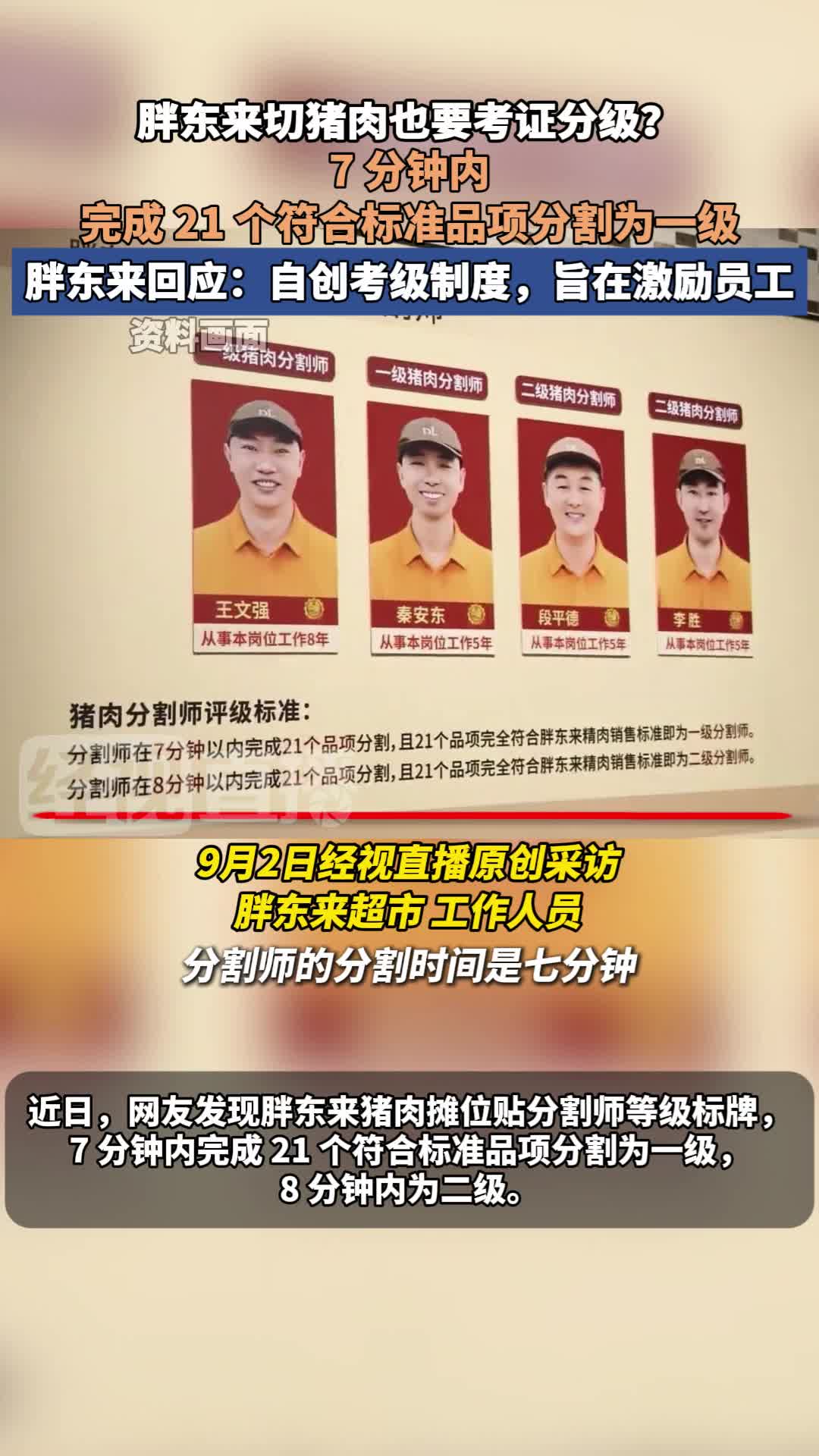 近日,网友发现胖东来猪肉摊位贴分割师等级标牌,7分钟内完成21个符合标准品项分割为一级,8分钟内为二级。9月2日,超市工作人员称这是自创考级制度,旨在激励员工提升技能,一级考核含分半扇猪肉,且等级高薪资更优厚。