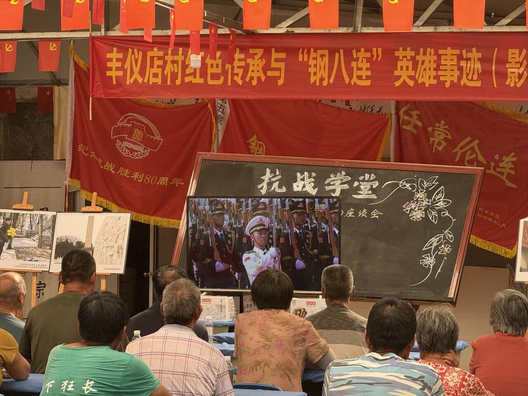 抗战学堂位于丰仪店战斗革命纪念馆内,供日常开展红色教育使用。3日上午8时许,在丰仪店村党支部书记慕泉欣的组织下,村民们落座课桌前,他们中年龄最大的已超过80岁。大家聚精会神地观看直播,看到英姿飒爽的战士们,不少村民眼眶湿润,抗战学堂内频频响起热烈的掌声。