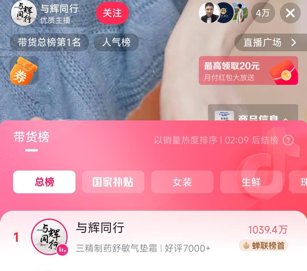 极目新闻记者注意到,董宇辉连续发布7个现场视频,引发不少粉丝点赞支持,相关话题“与董宇辉一起观礼九三阅兵”登上热搜,有粉丝拍到董宇辉在观礼现场的照片,并积极到与辉同行直播间下单支持。截至3日下午6时,抖音实时带货人气榜显示,与辉同行超1039.4万人气,在带货总榜高居断层第一。