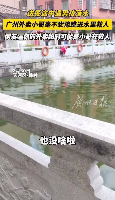 8月30日中午,外卖小哥郑张勇前往天河区珠村南门上街送外卖,途经南门上街5号旁一处池塘时,遇到一名男孩求助,有一位小朋友掉进池塘里了。在危急之时,郑张勇将手机递给岸上的男孩,自己脱下球鞋,翻过围栏,跳下水里,成功将水里的小孩救了上岸。