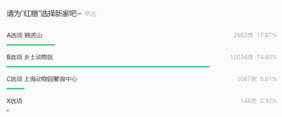 “投票贴”发出后,引起大量喜爱“红糖”网友的关注,连远在北京、广东、云南等地的网友都纷纷投票。投票数也很快攀升到了约1.6万票,其中12034票(74.6%)投给了“乡土动物区”,2882票(17.87%)投给了“狮虎山”,1067票(6.61%)投给了“上海动物园繁育中心”。
