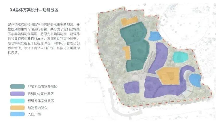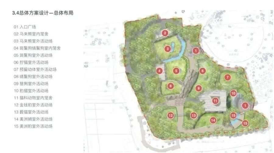 因此,园方将于9月起对中型猛兽展区进行改造,主要建设内容包括室外活动场改造、室内笼舍改造、优化观赏园路和后勤服务通道、绿化调整与提升以及配套水电工程等,占地面积共8060㎡。改造后,非猫科动物展区将拆除原有笼舍,增加各动物室内笼舍数量及室外活动场面积,并在场地外再设置12间20m²、具有串笼通道及饲养员操作通道的非展出室外笼舍,供马来熊、斑鬣狗及缟鬣狗使用。而猫科动物展区也将拆除原有笼舍,重新规划布局与路线,将猫科动物集中收笼,提升管理效率,减少动物之间相互影响。