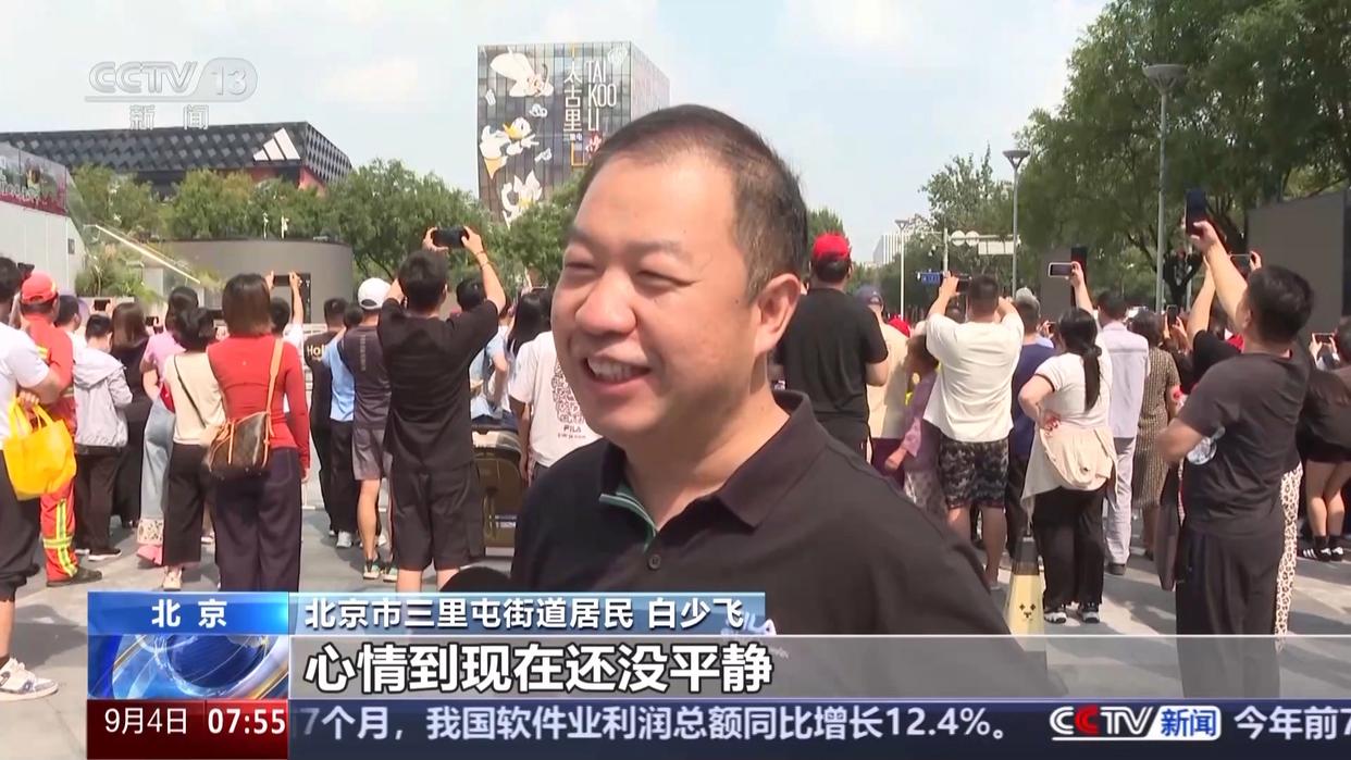 北京市三里屯街道居民 白少飞:刚刚通过大屏看了直播,心情到现在还没平静;此时此刻,感觉到80年前我们的先烈先辈们抗战取得的胜利,给我们带来了今天这样的和平,我感到很自豪。