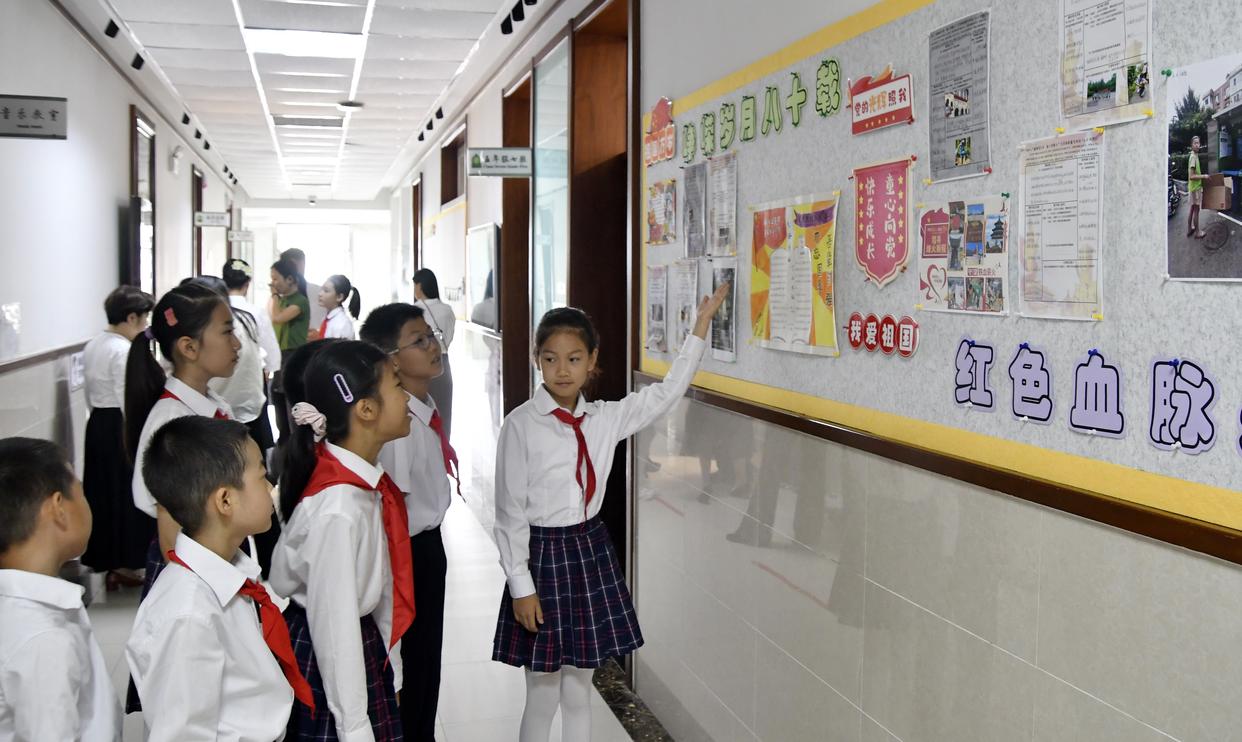 9月4日,北京市东城区黑芝麻胡同小学学生在校园内观看爱国主义教育绘画、板报展览。新华社记者 李欣 摄