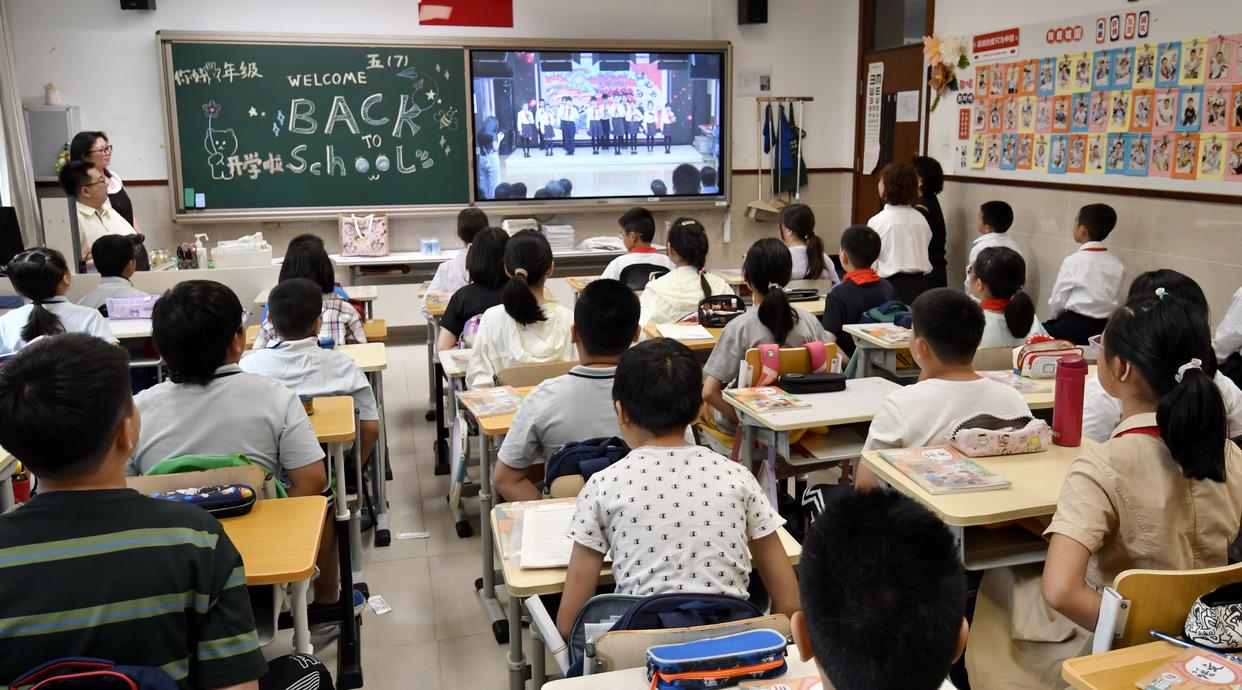 9月4日,北京市东城区黑芝麻胡同小学学生收看学校组织的爱国主义教育思政课。新华社记者 李欣 摄