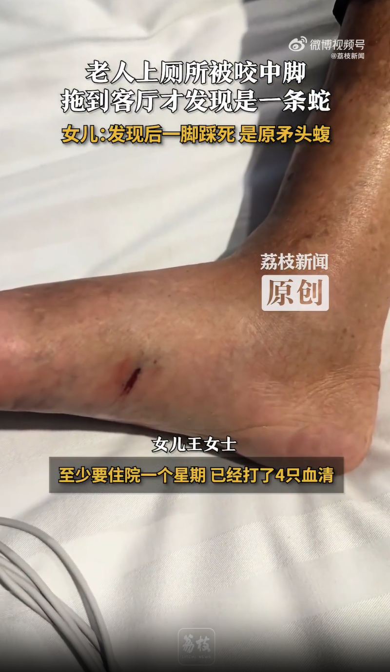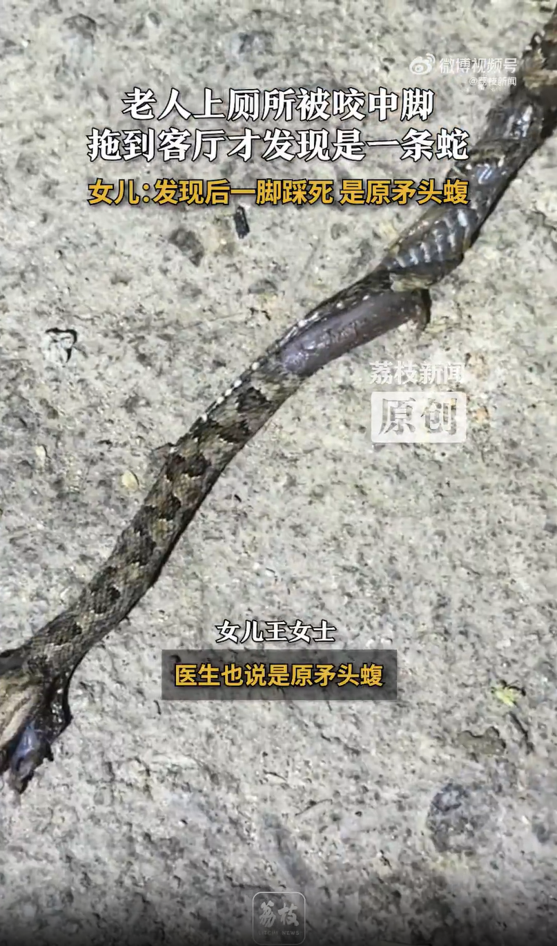 近日,湖南邵阳,老人夜里上厕所被咬中脚,拖到客厅才发现是一条蛇。