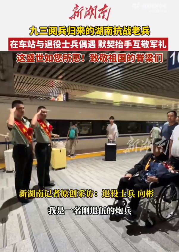 9月4日,湖南省参加抗战胜利80周年纪念活动代表返长。湖南抗战老兵张汉奇、袁寿春等在高铁站偶遇中国人民解放军炮兵部队退役士兵向彬、伍龙。