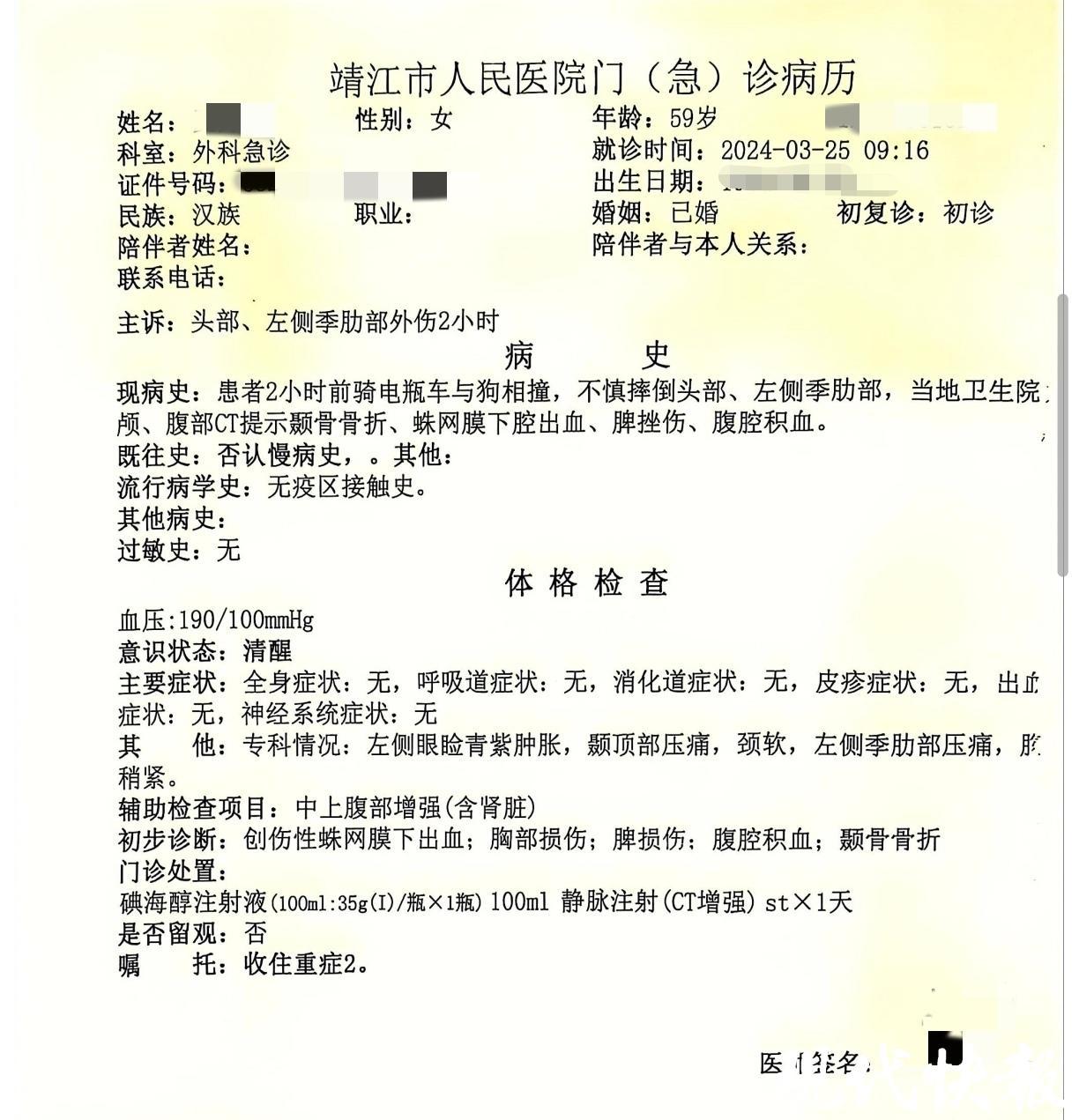 “当时我正常骑着电动车,哪想到突然冲出来一只狗!”2024年3月25日,王大妈骑着电动车行驶到靖江市新桥镇新太路吉盛桥西侧路段时,一只没有拴绳子的大狗,突然加速冲了过来,径直撞向她的电动车。