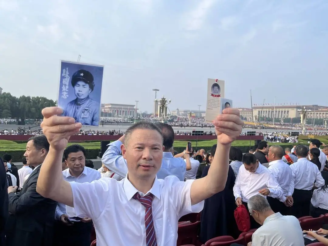9月3日上午,何正全站在天安门广场,代表两代英烈见证国家以最庄严的方式纪念胜利。