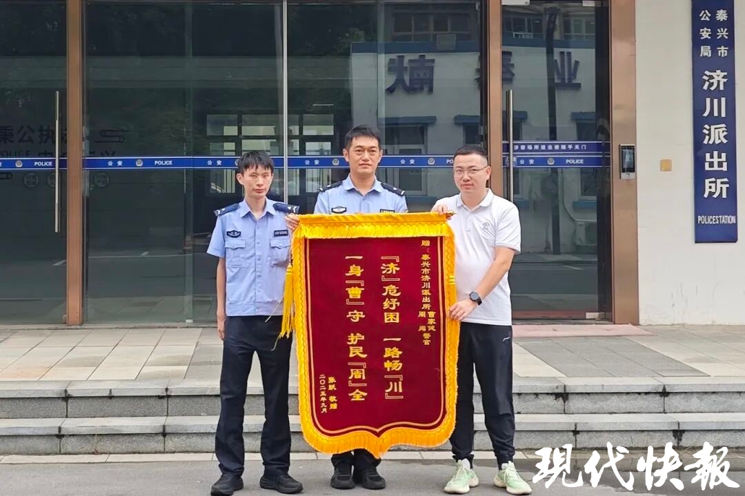9月2日上午,泰州泰兴市民张先生将写有“一身‘曹’守,护民‘周’全”的锦旗和感谢信交到泰兴市公安局济川派出所民警周闯和辅警曹家健手中,感谢他们在危急时刻鸣笛开道,把被毒蛇咬伤的母亲及时送医,为抢救赢得了宝贵时间。