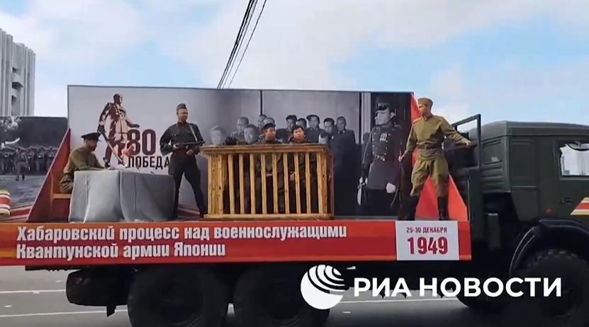 据报道,俄罗斯及多个集体安全条约组织的成员国代表出席了哈巴罗夫斯克的阅兵仪式。各式坦克、火箭炮等装备亮相。根据俄新社视频,阅兵队伍中还包括“场景演绎”方阵,在行驶过阅兵路线的卡车上可以看到“审讯日本战犯”的场景。