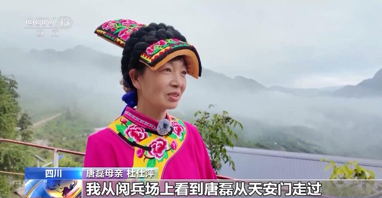 在四川绵阳北川开坪乡,曾在汶川地震中被救援,如今身着戎装接受检阅的唐磊的家乡正沸腾,他的父母与父老乡亲围坐电视机前,共同见证这一荣耀时刻,为他骄傲喝彩。