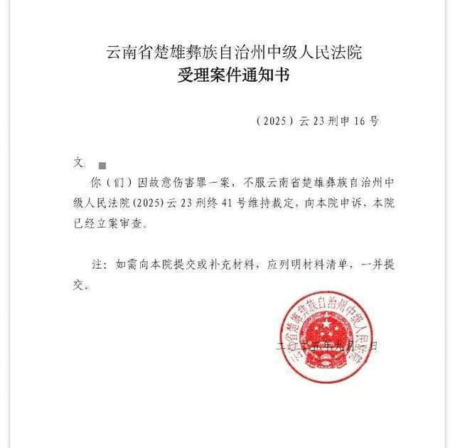 9月1日,楚雄彝族自治州中级人民法院向小文出具《受理案件通知书》,称已立案审查。