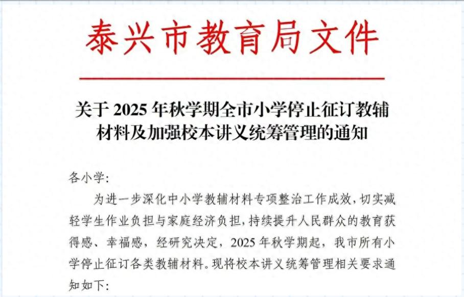 进入9月开学季,日前,江苏省泰兴市教育局印发的一份《关于2025年秋学期全市小学停止征订教辅材料及加强校本讲义统筹管理的通知》引发关注。其中明确规定,自2025年秋学期起,全市所有小学停止征订教辅材料。