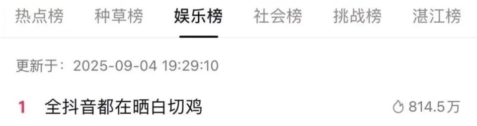 截至9月4日19时许,该相关视频在抖音平台已获得超740万热度,“全抖音都在晒白切鸡”成为该平台娱乐热榜第一话题。