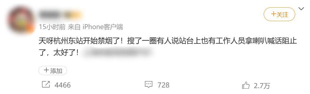 9月4日晚,“杭州东站禁烟”相关话题在社交网站上受到关注。有博主发帖称杭州东站开始禁烟,有工作人员在站台上用扩音器喊话阻止吸烟行为。另有博主发布的视频和图片显示,杭州东站站台上工作人员喊话提醒乘客候车时不要吸烟,劝乘客熄灭手中的香烟。站台区域地面也贴有禁止吸烟的标识。