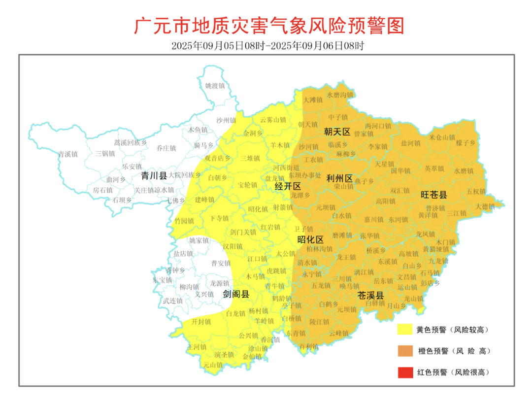 9月5日8时至9月6日8时,发布地质灾害气象风险预警预报:利州区宝轮镇、三堆镇、白朝乡、金洞乡;青川县竹园镇、沙州镇、建峰镇、茶坝乡、七佛乡、观音店乡;昭化区:红岩镇、昭化镇、青牛镇;朝天区:羊木镇、云雾山镇;剑阁县:普安镇、龙源镇等地为三级(黄色预警,风险较高)区域。