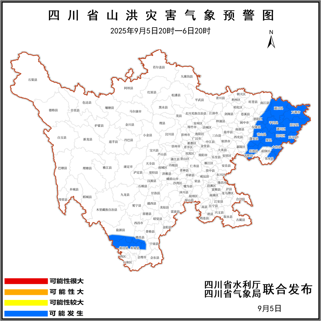 预警显示,2025年9月5日20时至6日20时,达州市万源、通川、宣汉、达川、渠县、开江、大竹,巴中市通江、平昌、巴州、恩阳、南江,广安市岳池、广安、武胜、邻水,南充市营山、仪陇、高坪、蓬安,攀枝花市米易、盐边,凉山州德昌、会理、盐源等6个市(州)25个县(市、区)可能发生山洪灾害。