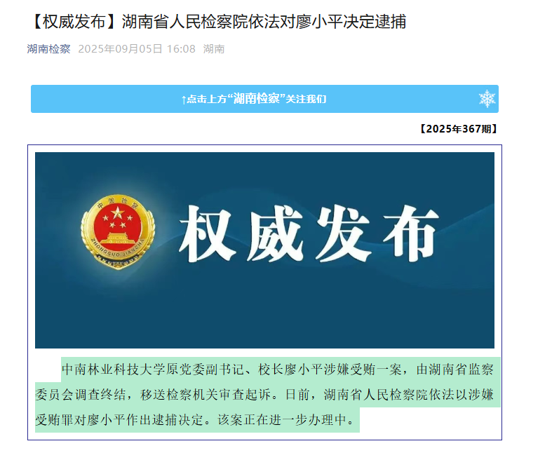 涉嫌受贿罪,中南林业科技大学原校长廖小平被逮捕