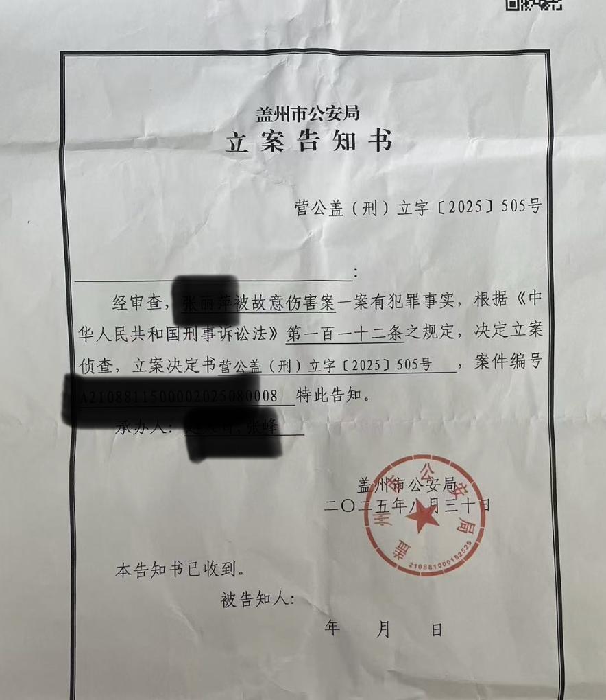于女士向记者提供了盖州市公安局8月30日开具的立案告知书,显示经审查张某某(母亲)被故意伤害案有犯罪事实,决定立案侦查。于女士也向记者提供了营口市中心医院提供的病情介绍,显示目前诊断为:直肠破裂,腹盆腔积液积气、混合型休克等,患者目前病情危急。