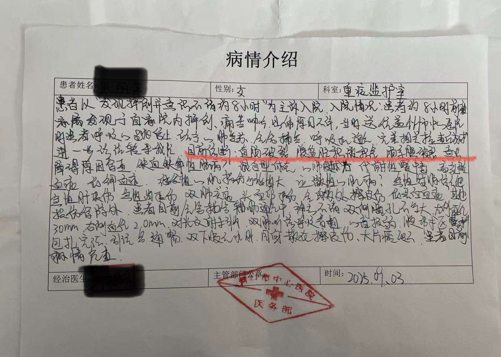 在病情介绍里提到,“家属发现患者于自家院内摔倒”,于女士说,张某就是想推卸责任,就是让别人以为是自己摔倒摔成这样的。后来她问妹妹,她说母亲被打后,就在家里在床上坐着躺着,她眼睛看不见了,更没法走路。