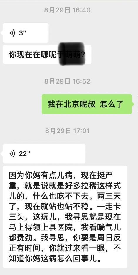 8月29日,她收到了母亲的微信,不过是张某用她的微信发来的消息,“他说我妈病了,不吃饭拉肚子,然后说带我妈去医院看下,可能要住院,有空来一趟。一小时后,他又发消息来,说我妈快不行了,就剩一口气。”张某发了个视频,于女士看到母亲头发没了,身上有伤,质问是不是被他打的,没有回复。
