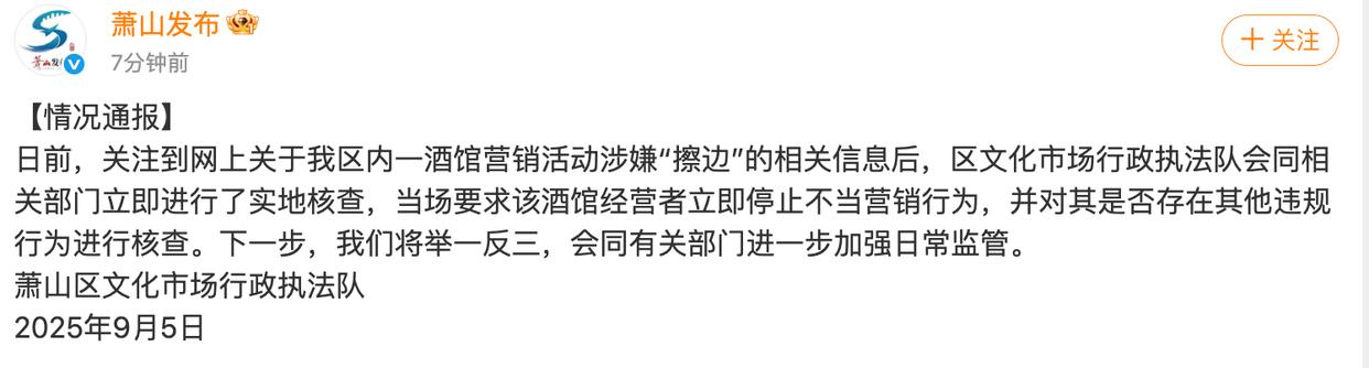 日前,关注到网上关于我区内一酒馆营销活动涉嫌“擦边”的相关信息后,区文化市场行政执法队会同相关部门立即进行了实地核查,当场要求该酒馆经营者立即停止不当营销行为,并对其是否存在其他违规行为进行核查。下一步,我们将举一反三,会同有关部门进一步加强日常监管。