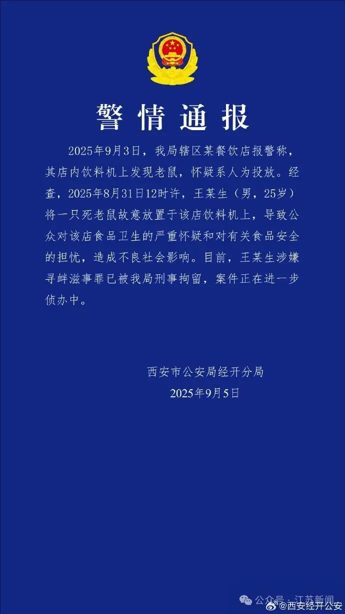 2025年9月3日,我局辖区某餐饮店报警称,其店内饮料机上发现老鼠,怀疑系人为投放。经查,2025年8月31日12时许,王某生(男,25岁)将一只死老鼠故意放置于该店饮料机上,导致公众对该店食品卫生的严重怀疑和对有关食品安全的担忧,造成不良社会影响。目前,王某生涉嫌寻衅滋事罪已被我局刑事拘留,案件正在进一步侦办中。