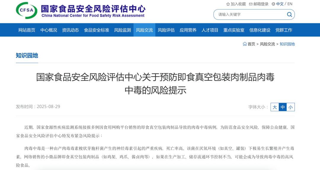 近期,国家食源性疾病监测系统接报多例因食用网购平台销售的即食真空包装肉制品导致的肉毒中毒病例。